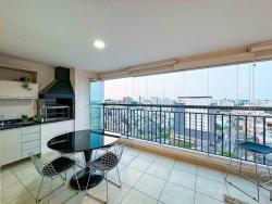 varanda gourmet com churrasqueira, andar alto, sol da manhã, janelas com persianas blackout, ar condicionado, aquecedor a gás, móveis planejados.